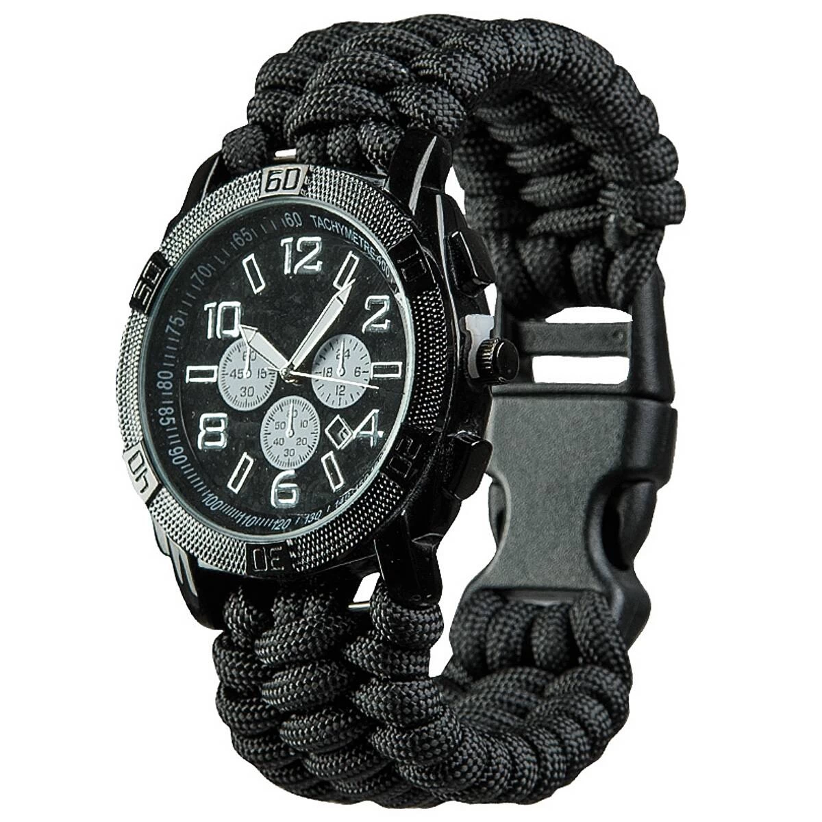 Diese tolle Army Uhr besitzt ein Armband, welches aus einer geflochtenen Fallschirmleine mit Clipverschluss besteht. Im Notfall kann das Armband aufgeflochten werden und es lässt sich zu einem reißfesten Seil umfunktionieren. Paracord (Fallschirmleine) ist ein stabiles Outdoor-Seil aus Nylon, welches sich bei vielen Gelegenheiten als nützlich erweist. Man kann es als Abspann-, Zelt- oder Wäscheleine oder zur sicheren Befestigung von Ausrüstungsgegenständen nutzen. (Allerdings ist es nicht zum Klettern geeignet!) Die Uhr besitzt ein stabiles Edelstahlgehäuse und bietet eine Stunden-, Minuten-, Sekunden- und Kalenderanzeige.