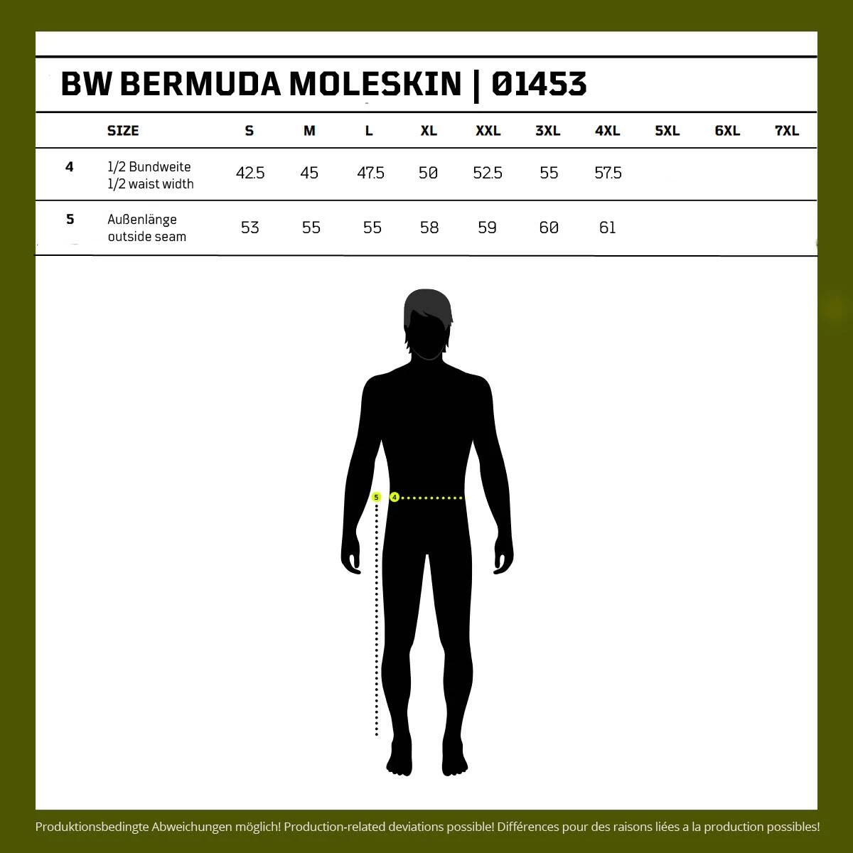 Hochwertige Verarbeitung und hoher Tragekomfort – das zeichnet die klassische Bundeswehr Moleskin-Bermuda in der bekannt pflegeleichten und strapazierfähigen Qualität aus. Das stabile Moleskingewebe ist super reißfest und strapazierfähig aber dennoch sehr angenehm zu tragen. Die Bermuda besitzt 2 seitliche Einschubtaschen, eine Gesäßtasche zum Knöpfen sowie 2 geräumige seitlich aufgesetzte Bein-Pattentaschen mit Knopfverschluss. Die Taille kann bequem in der Weite verstellt werden. Am Bund befindet sich ein Knopfverschluss. Des Weiteren besitzt die BW Bermuda 50 mm breite Gürtelschlaufen sowie Knöpfe für Hosenträger. Die Short wurde bei der Produktion über ein spezielles stonewashed Verfahren gewaschen, was den Tragekomfort noch einmal deutlich erhöht.