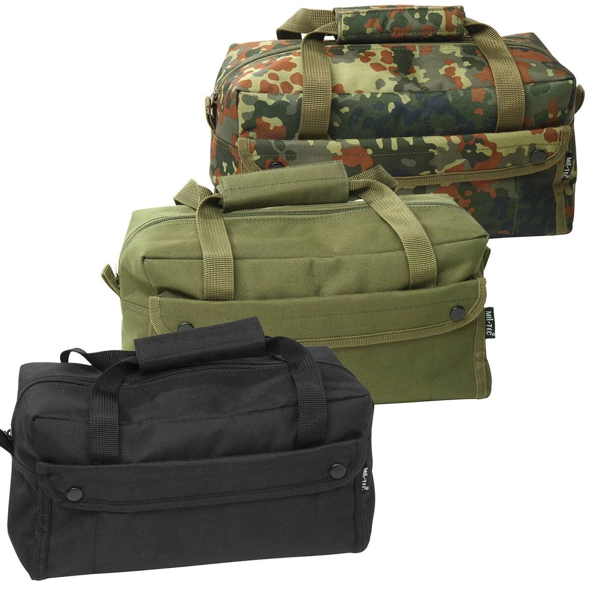 Die praktische Handgepäcktasche besitzt ein großes Hauptfach mit Mittelreißverschluss und Steckfächern links und rechts für Stifte, Werkzeug usw. Des Weiteren hat die Einsatztasche 2 aufgesetzte Aussentaschen mit Abdeckung und Druckknopfverschluss, einen verstärkten Boden und einen gepolsterten Tragegriff.