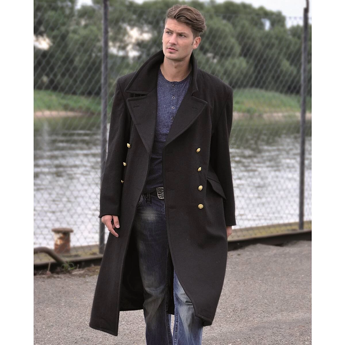 Der edel aussehende Bundeswehr Marine Mantel ist durchgehend gefüttert, zweireihig geknöpft und besitzt die bewährten maritimen Knöpfe mit Ankermotiv. Er kann in beide Richtungen übereinandergeschlagen und geschlossen werden. In den zwei großen Pattentaschen gibt es genug Platz für das Wesentliche. Außerdem besitzt der Mantel 2 Innentaschen. Auf der Rückseite befindet sich ein ca. 60 cm langer Schlitz, der mit Hilfe der 3 angebrachten Knöpfe beliebig geschlossen oder erweitert werden kann. Zusätzlich gibt es ein breites Rückenband, welches über zwei goldene Knöpfe verfügt.