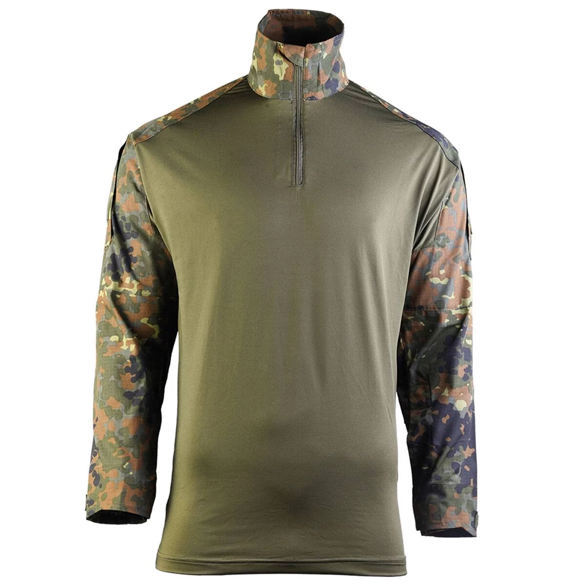 Dieses taktische Feldhemd eignet sich ideal zum Tragen unter einer Weste. Es besteht aus zwei Komponenten: Der Torso ist aus angenehmen und elastischen Stretch, die Ärmel aus strapazierfähigem Ripstop-Material. Das leichte Combat Shirt mit geradem Schnitt besitzt einen hochschließenden Kragen mit Reißverschluss, zwei Ärmeltaschen mit Klettaufnahme, Ellenbogenverstärkung sowie durch Klett regulierbare Ärmelabschlüsse. In der Ellenbogenverstärkung kann man zusätzlich von Innen ein Schaumstoffpolster befestigen (nicht im Lieferumfang).