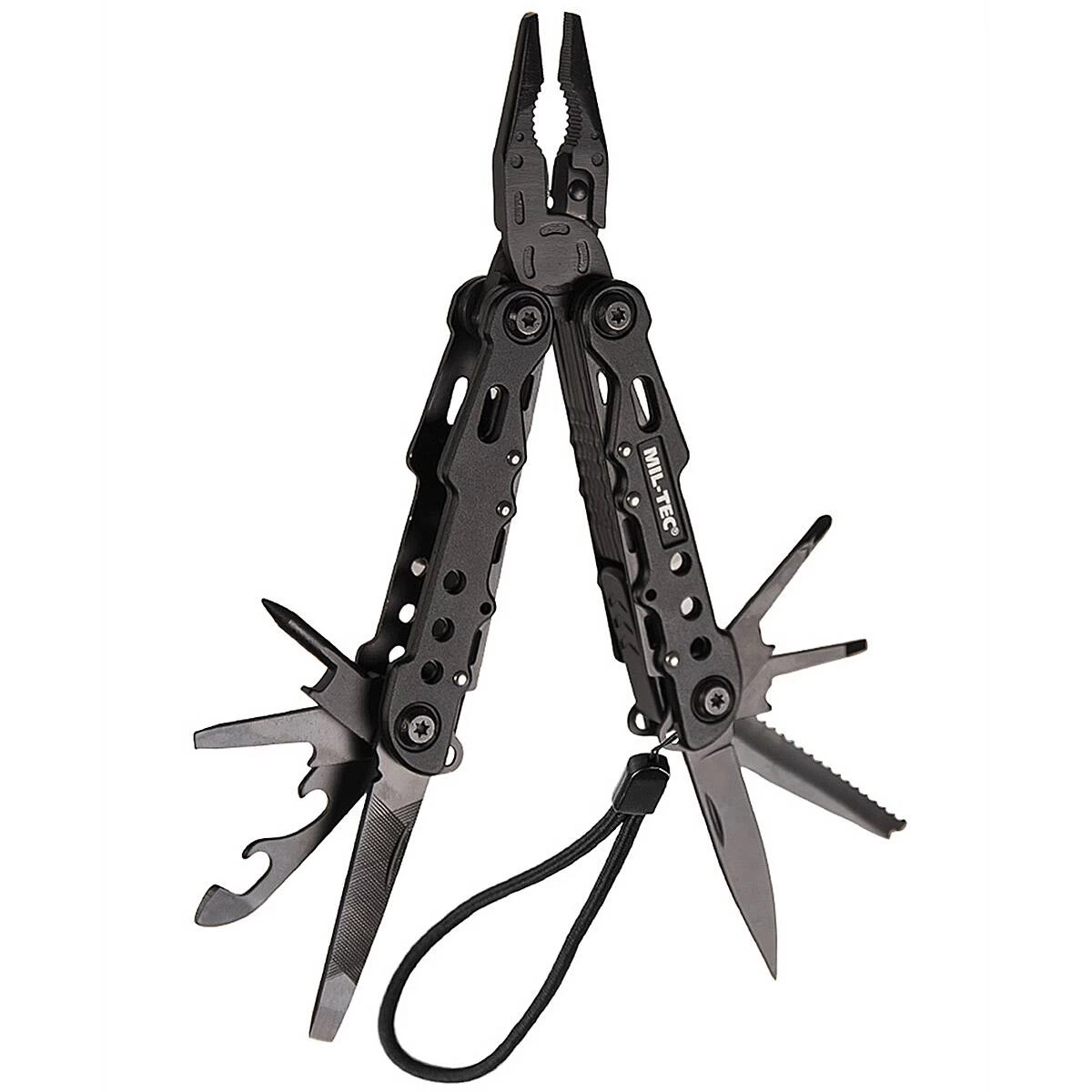 Das kompakte Multi Tool BLACK mit Lanyard-Kordel besitzt 9 praktische Werkzeuge, die es zu einem täglichen Begleiter für drinnen und draußen machen. Im Detail stehen eine Zange, eine Feile, ein Dorn, 2 Schlitz- und ein Kreuzschraubendreher, ein Dosenöffner, ein Messer und eine Säge zur Verfügung. Alle Werkzeuge lassen sich bequem mit einer Hand ausklappen. Die Arretierung ermöglicht ein sicheres und genaues Arbeiten.