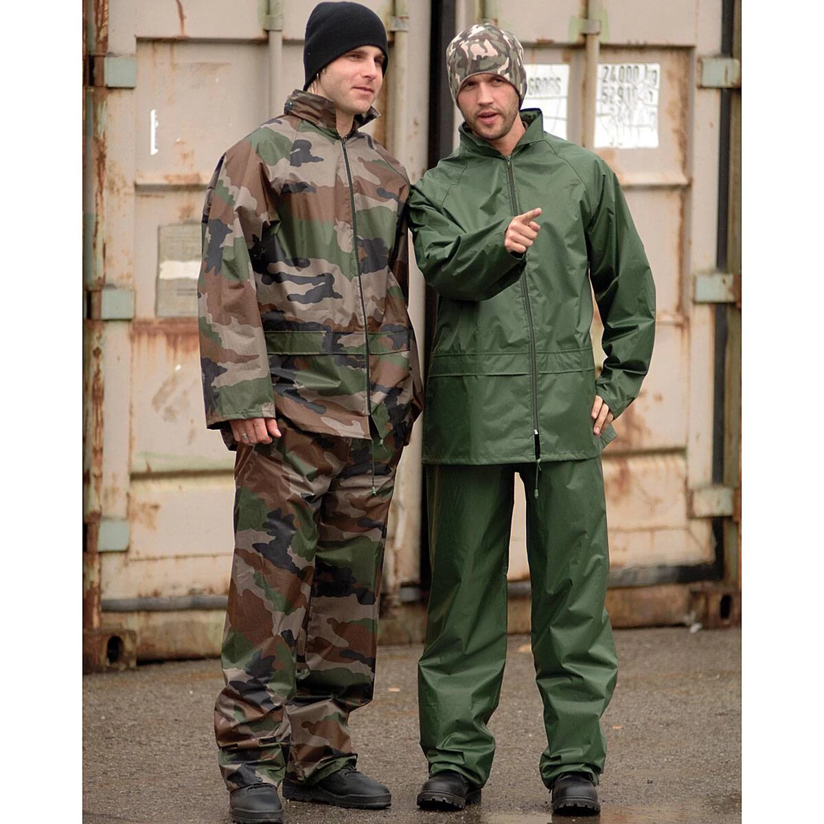 Dieser sehr leichte Wetterschutzanzug besticht durch sein kleines Packmaß und wird inkl. Tasche geliefert. Die Jacke besitzt einen Frontreißverschluss, eine integrierte Kapuze im Kragen sowie 2 seitliche Einschubtaschen. Sie hat einen Abschlussbund mit Kordel und Stopper. Die weit geschnittene Regenhose besitzt 2 Durchgreiftaschen und am Hosenbund einen elastischen Gummizug. Am Beinabschluss befinden sich Druckknöpfe.