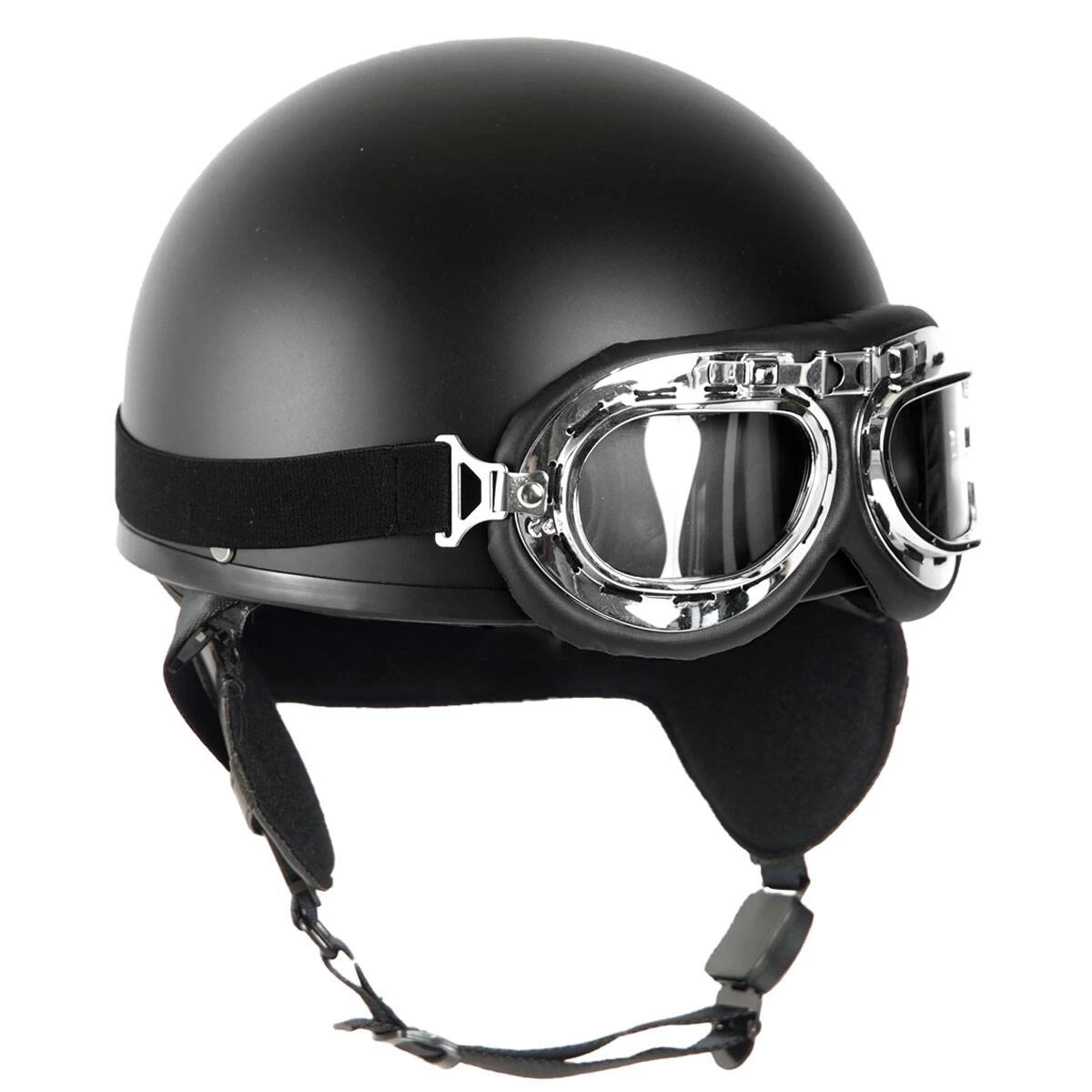 Der robuste Halbschalenhelm aus ABS Kunststoff ist im Retro-Look gehalten und erinnert an die Motorradhelme der 50er Jahre, insbesondere in der ehemaligen DDR. Er besitzt ein Futter aus EPS-Hartschaum für eine optimale Stoßdämpfung sowie ein weiches, komfortables und schweißabsorbierendes Mesh-Innenfutter. Der Helm wird inkl. einer tollen Fliegerbrille mit Gläsern aus Polycarbonat mit einer Anti-Beschlagbeschichtung ausgeliefert. Am Kinnband befindet sich ein praktischer Klickverschluss.