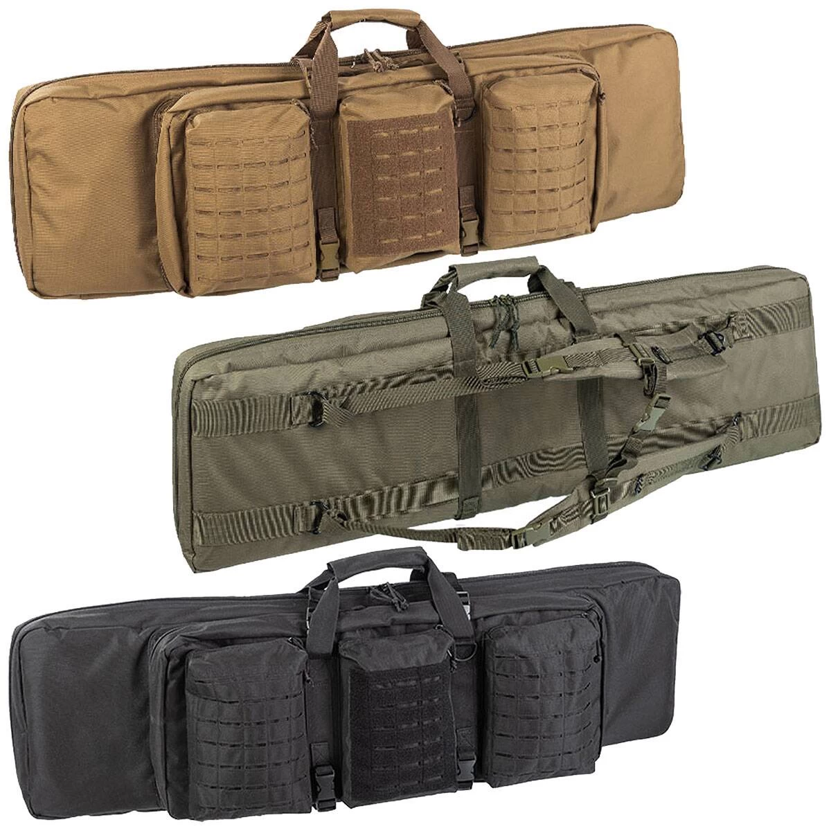 Das gepolsterte Rifle Case Double von Mil-Tec ist geeignet für 2 Lang- und 2 Kurzwaffen. Die Langwaffen können im Hauptfach mit je zwei Klettbändern fixiert werden und es gibt ein kleines Fach mit zwei Klettverschlussfächern für Kurzwaffen. Auf der Innenseite des kleinen Fachs befinden sich außerdem Molle-Aufnahme-Schlaufen. Weitere Details sind: