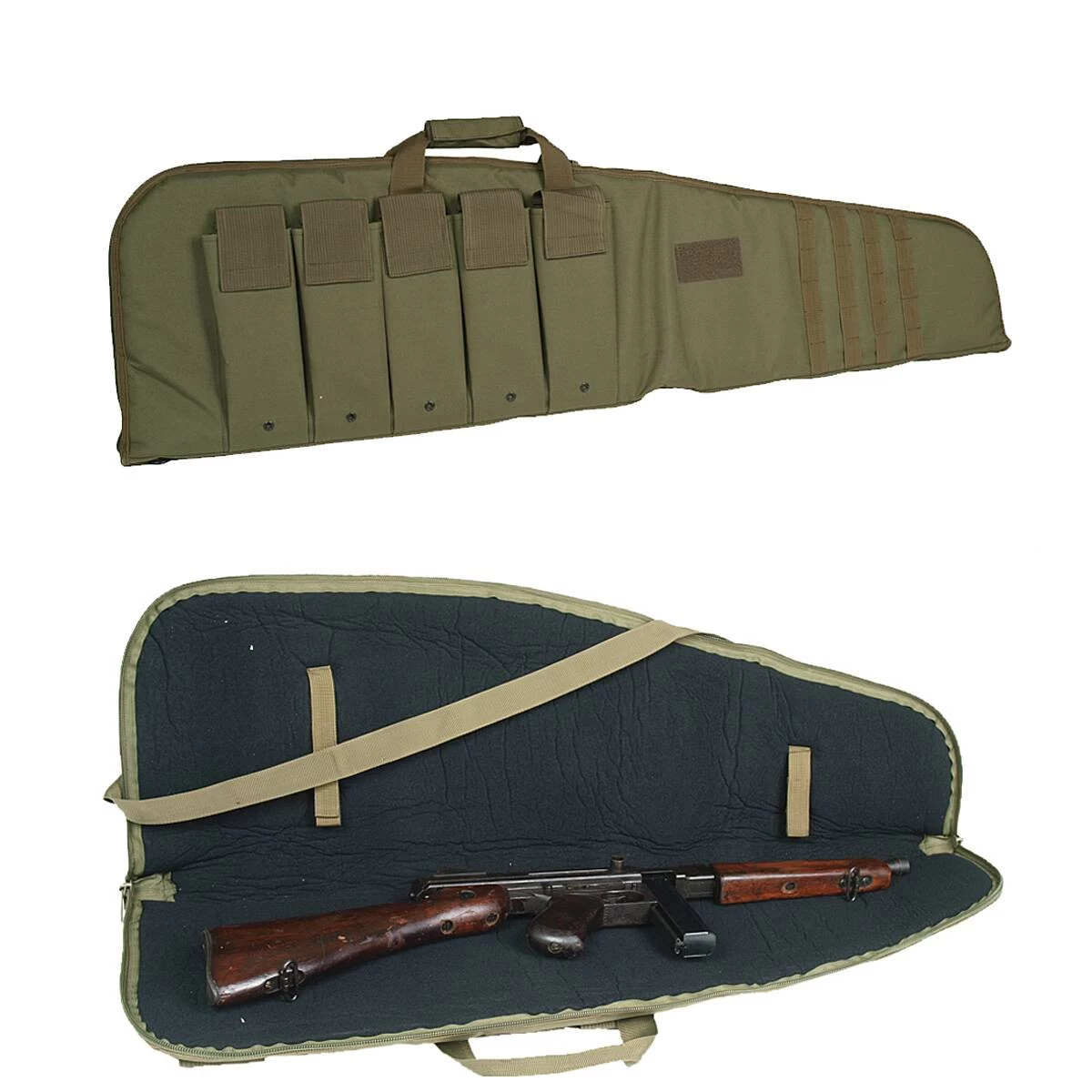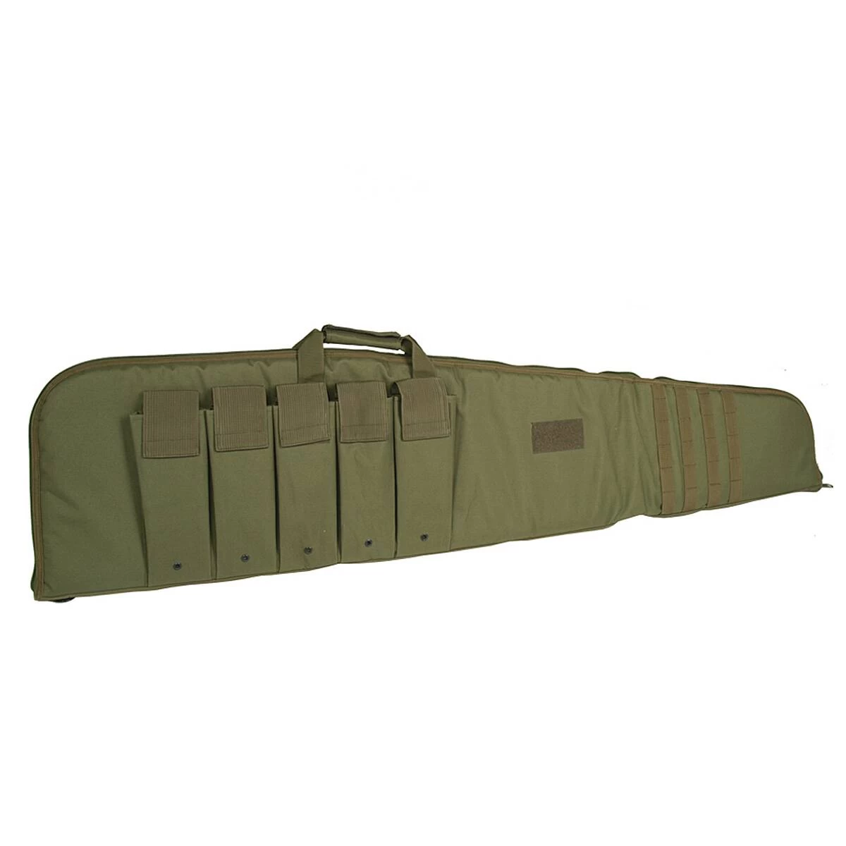 Das multifunktionale MIL-TEC Gewehrfutteral besitzt ein langes Hauptfach mit Klett-Fixiergurten, die es ermöglichen, eine Waffe sicher aufzubewahren. In den 5 aufgesetzten Außentaschen mit Ablaufösen kann man verschiedenes Zubehör, z.B. Magazine oder Reinigungsmittel, unterbringen. Die Abschließvorrichtung, bestehend aus einem Reißverschluss-Zipper und einem D-Ring, sichert die Waffe vor unerwünschtem Zugriff. Die Gewehrtasche lässt sich mittels des verstellbaren Tragegurts oder des Tragegriffs einfach und sicher transportieren. Außerdem hat das Rifle Case eine große Klettfläche, auf der ein Namensschild oder andere Patches angebracht werden können, sowie verschiedene Molle-Schlaufen, an denen weitere Ausrüstung befestigt werden kann. Es ist in drei verschiedenen Längen erhältlich.