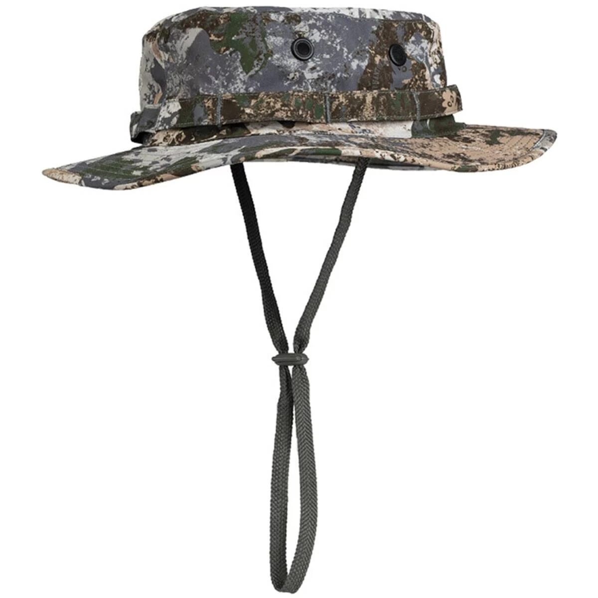 Der US GI Buschhut ist an heißen, sonnigen Tagen der ideale Kopfschutz. Er besitzt eine breite wellenförmige, ca. 8 cm breite Krempe. mit dem Kinnband kann diese nach oben umgeschlagen werden. Die rundumlaufenden Laschen dienen als Haltevorrichtung zur Anbringung von Tarn oder Kleinmaterial. Des Weiteren hat der Boonie vergitterte Belüftungsöffnungen.