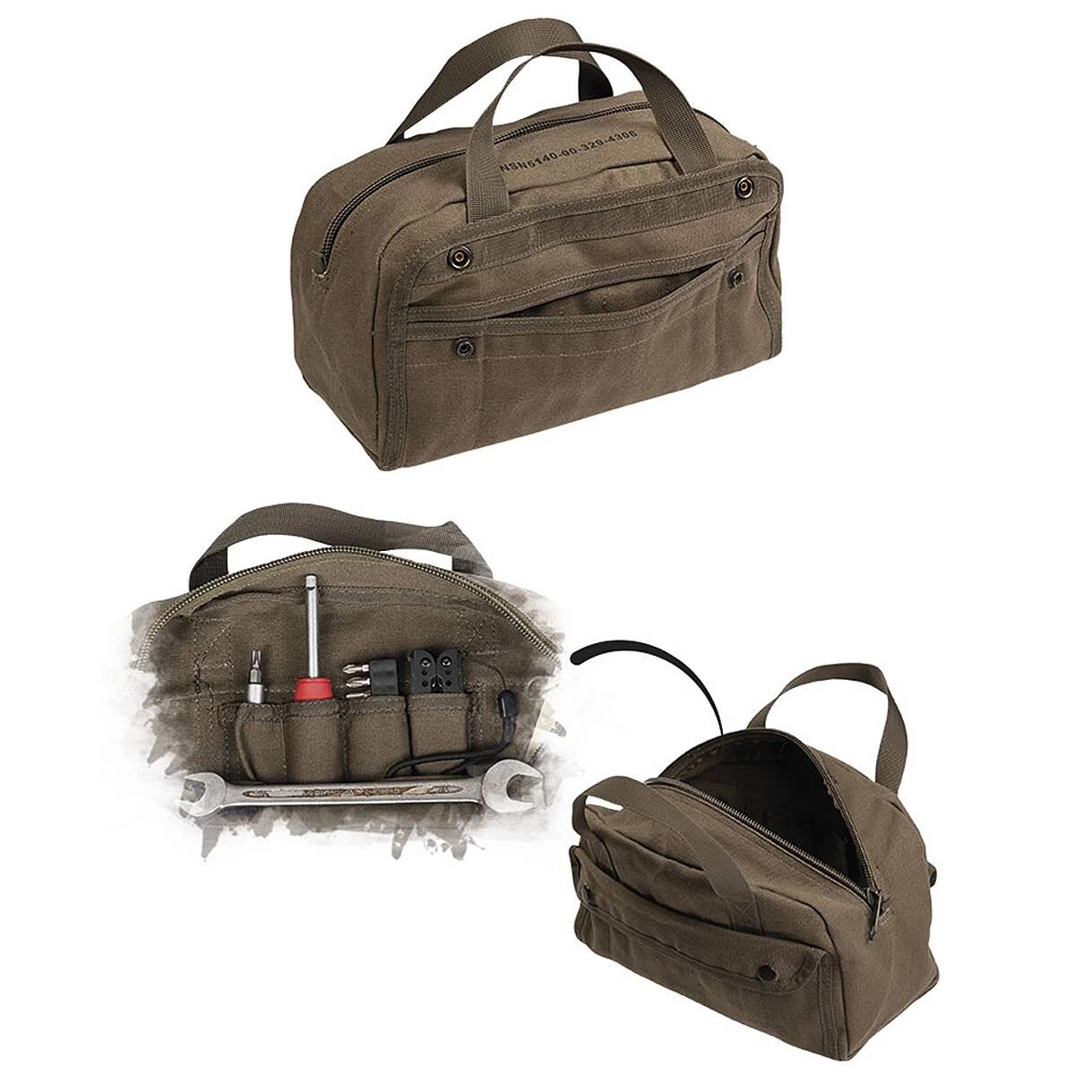 Das Mechanic Tool Bag von MIL-TEC besitzt ein großes Hauptfach mit Steckfächern für Werkzeuge und Ausrüstung, zwei unterteilte große Außentaschen mit Druckknöpfen sowie einen robusten Tragegriff. Das Hauptfach wird mit einem Reißverschluss verschlossen. Außerdem besitzt die Werkzeugtasche einen verstärkten Boden.